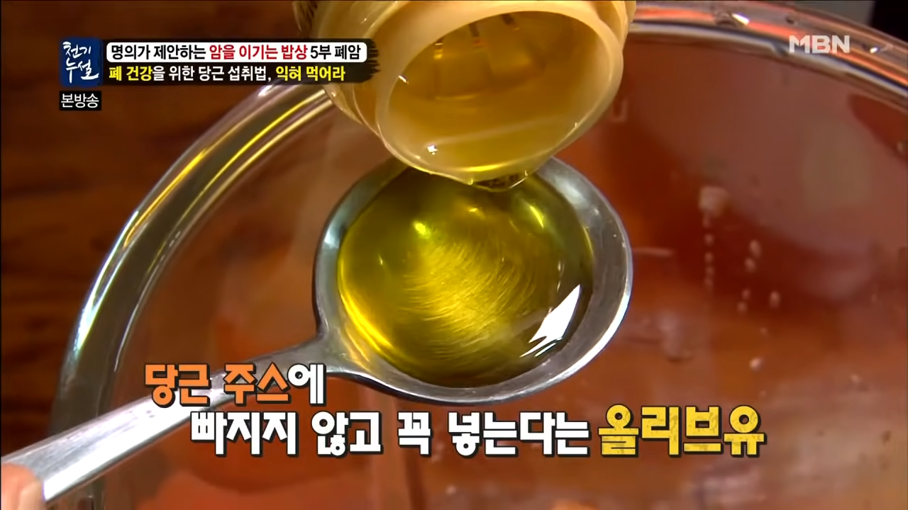 당근주스에 올리브유를 한 숟가락 정도 넣게 되면 당근 속 풍부한 베타카로틴의 체내 흡수율을 높일 수 있습니다. 이 베타카로틴 성분이 지용성이기 때문입니다. 당근에 기름을 더하게 되면 베타카로틴의 흡수율이 60~70%까지 높아질 수 있습니다.