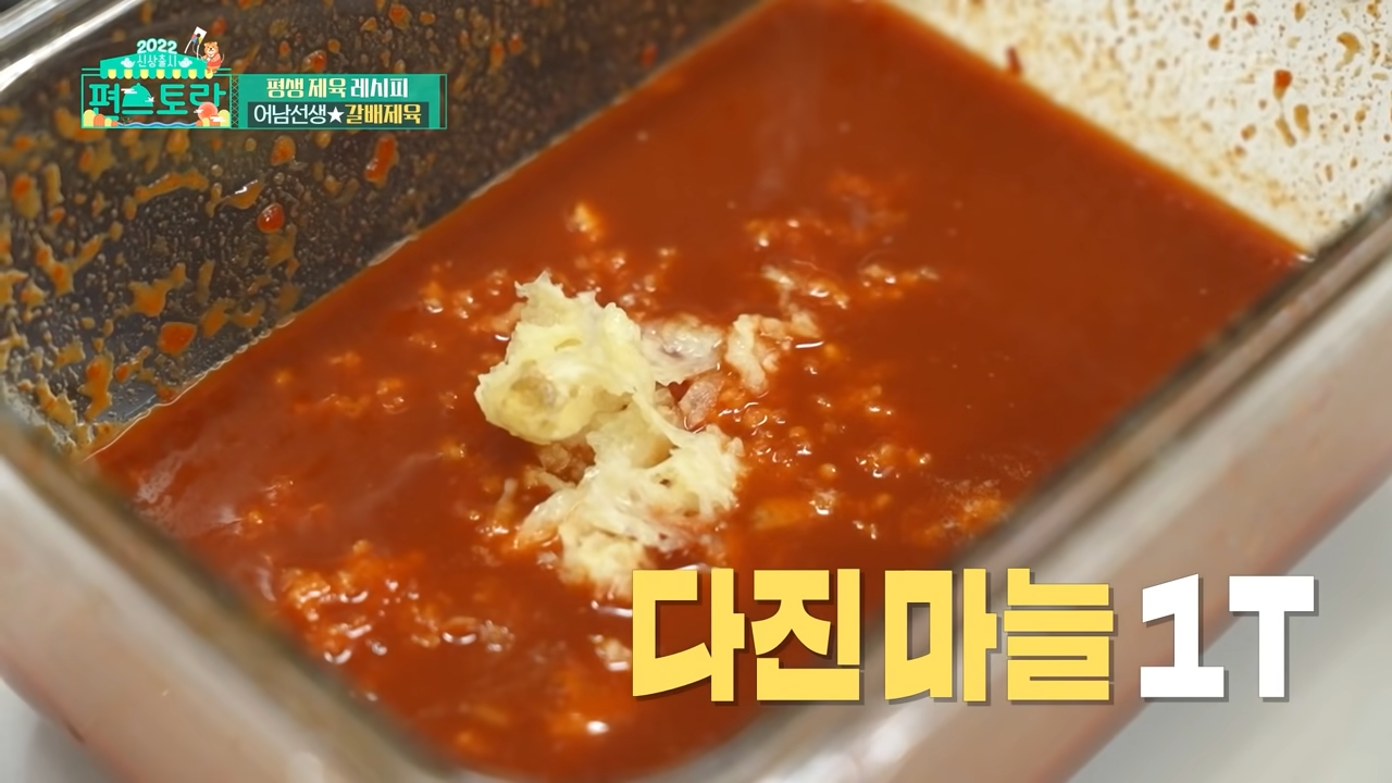 다 섞은 양념장에 다진마늘 1스푼까지 넣으면 완성입니다.