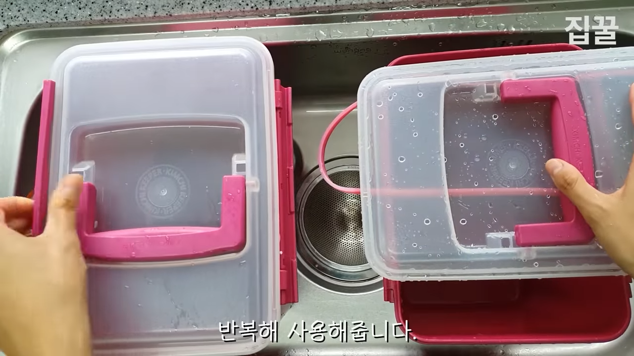 제가 자주 사용하는 방법입니다. 김치통에 물을 1/2정도 채운 뒤 식초를 소주잔으로 2잔을 넣고 뚜껑을 덮은 후 뒤집어 1시간 정도 놔둡니다. 안에 있던 식초물을 버리고 깨끗하게 헹구면 김치냄새가 사라집니다.
